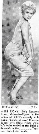 A former "Miss Detroit" and WAMPAS Baby Star of 1956, pouty Roxanne Arlen popped up on 1950's and 60's screens as sexy second leads in B-movies and TV episodes. She was tagged "The Wiggle" for a trademark walk she claimed to have developed at grade school, and, curiously, found herself unable to 'get rid of' (!). That 'wiggle' certainly got her noticed during her first auditions in Hollywood in 1953. Inevitably, most of her early roles were bit parts. There is not much to say about those, except that Roxanne was decorative enough as assorted unnamed 'girls', 'models' or 'blondes'. She made a breakthrough of sorts on the stage, as the star of the comedy "Who Was That Lady I Saw You With?", written by Norman Krasna. The play first aired in Philadelphia and then opened on Broadway in March 1958, eventually notching up a respectable 208 performances. Alas, for the remainder of her screen career, Roxanne remained firmly typecast as dumb blondes with easy ways and names like Flo, Dixie or Bootsie. She retired from the screen in 1967 and was last glimpsed recreating her screen role as burlesque house stripper Electra in Gypsy (1962), for a Miami stage production in May 1970.
